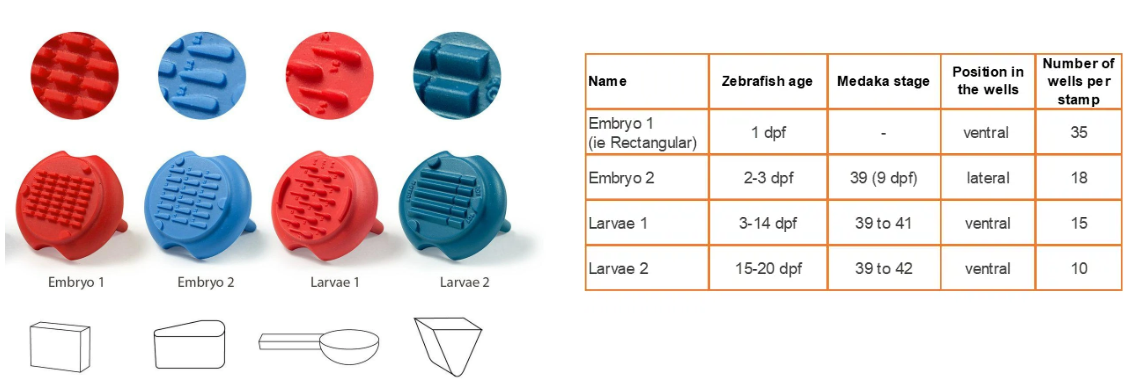 Stampwell stamps imprint arrays of wells in hydrogels in just one time. Nothing more to do than load your samples into the wells and image. The Stampwell shapes have been optimized for the imaging of fish embryos or larvae up to 20 dpf.