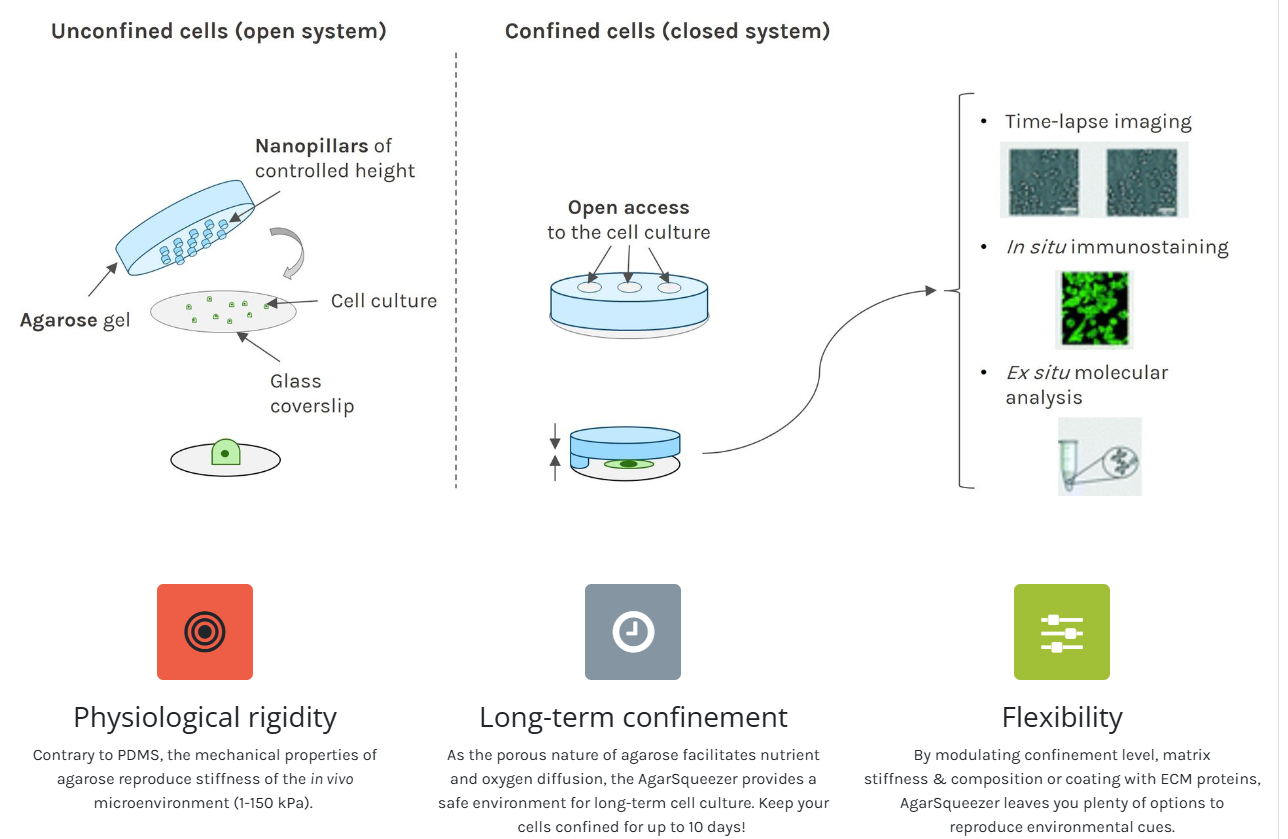 AgarSqueezer is a microscope slide chamber equipped with a molded agar-based compression system. Use it to apply an instant & homogeneous compression on your cells, and study their response to short and long-term confinement.